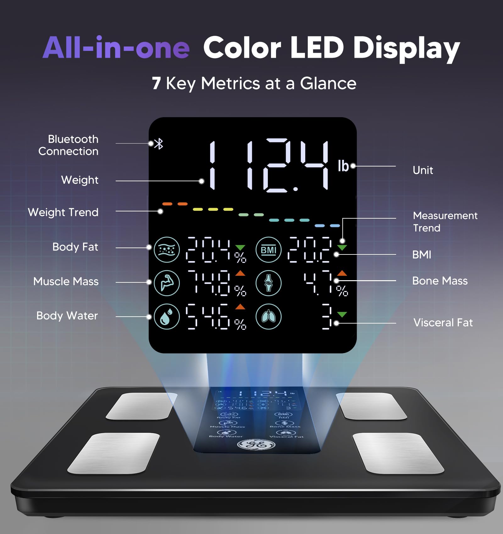 GE Smart Scale for Body Weight: 8-Electrode Digital Bathroom Scale for Weight Fat BMI Muscle Mass Full Body Composition Analyzer 27 Measurements Bluetooth Highly Accurate Weighing Machine, 400 lbs