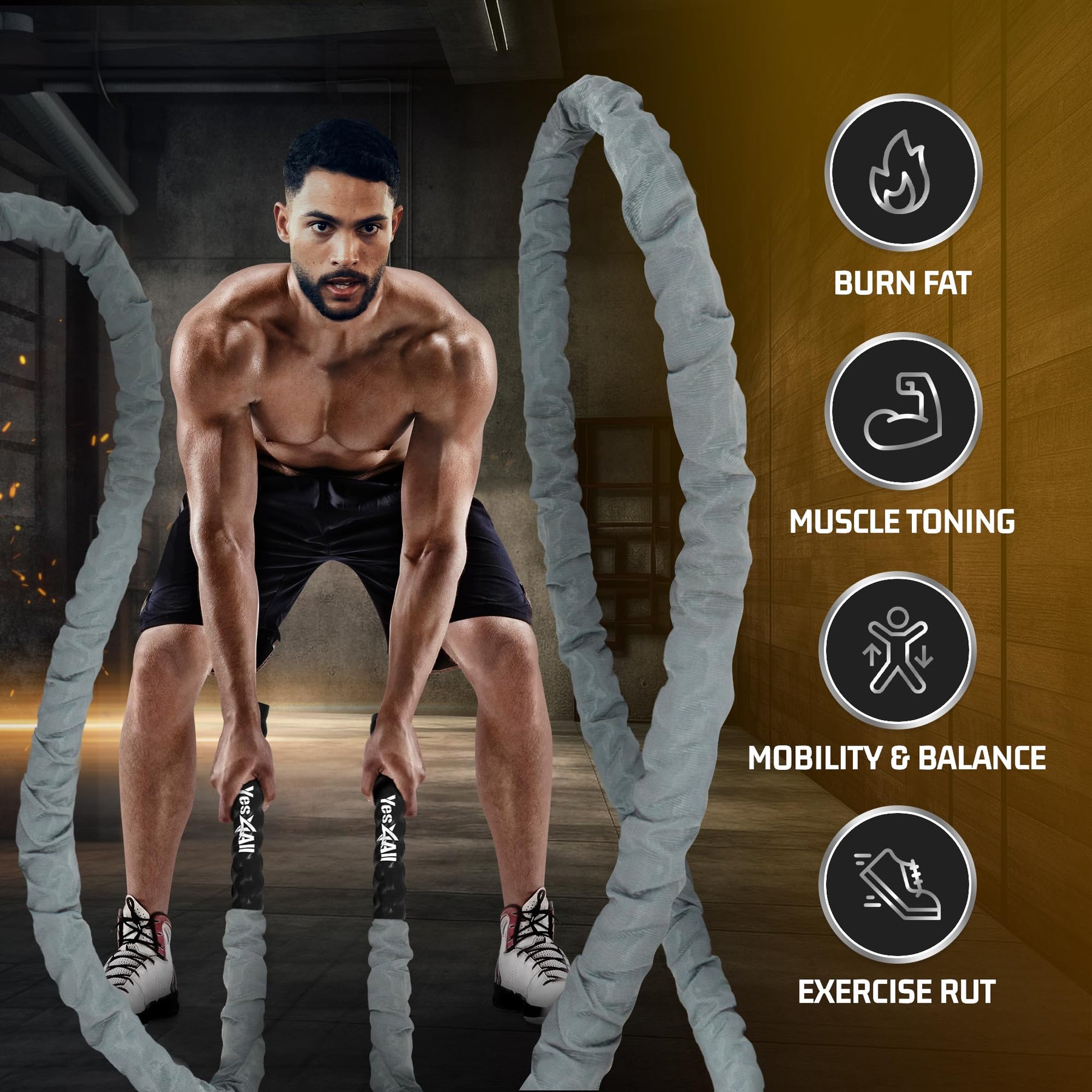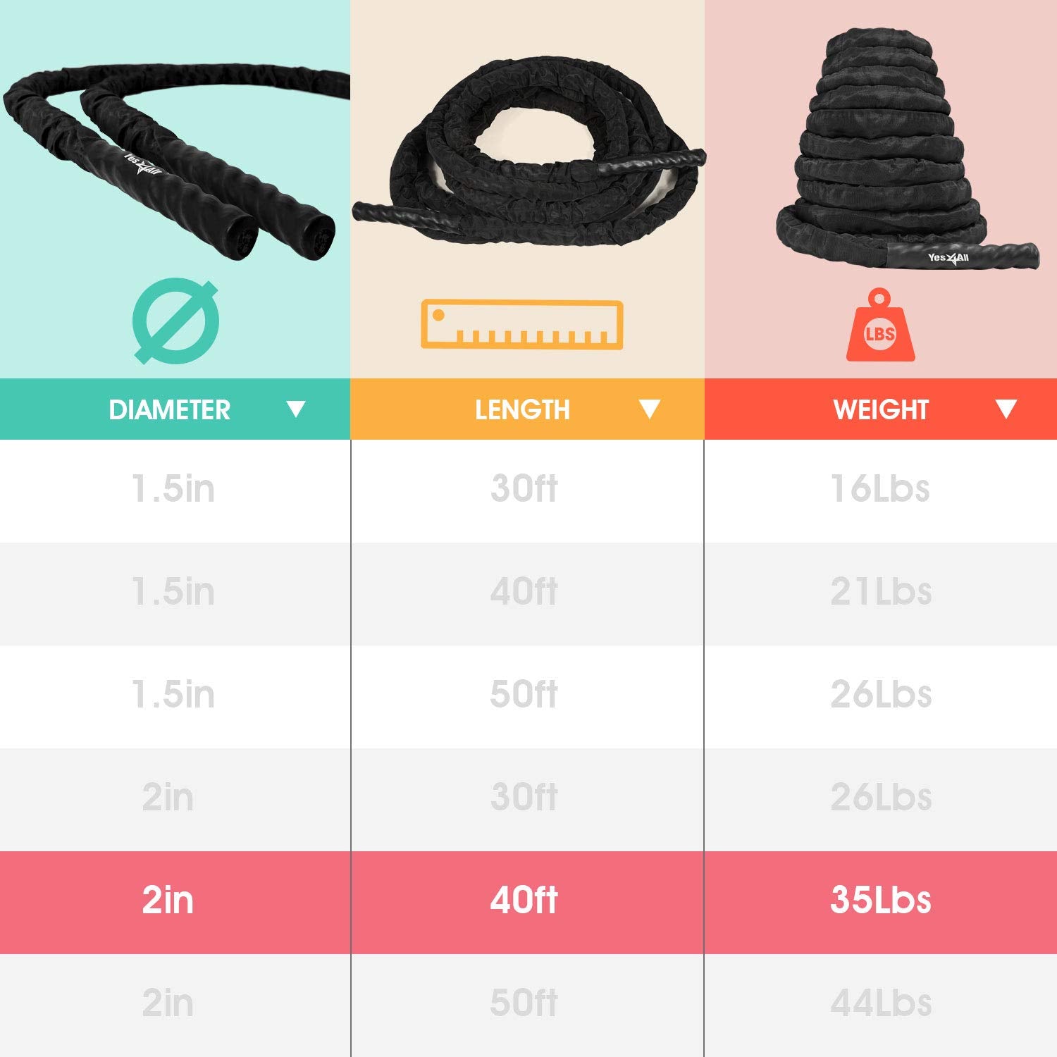 Yes4All Battle Ropes, Workout Rope with Cover, Steel Anchor & Strap Included, Heavy Ropes for Exercise Training - 1.5/2 Inch Diameter, 30, 40, 50 Ft Length