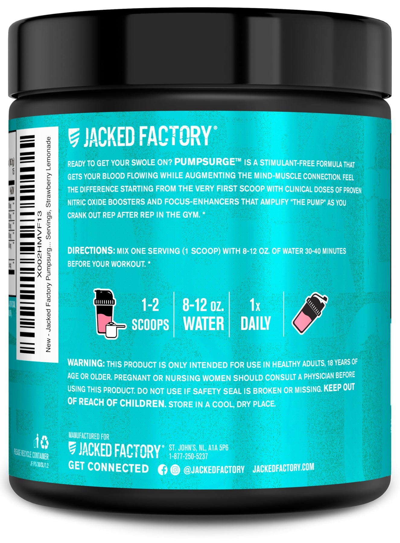 Jacked Factory Pumpsurge Caffeine Free Pre Workout for Men & Women - Nootropic Booster & Stim Free Pre Workout - Intense Pumps, Enhanced Focus - 30 Servings, Strawberry Lemonade