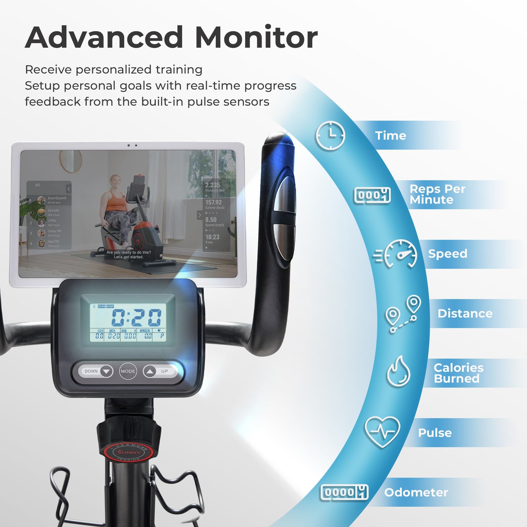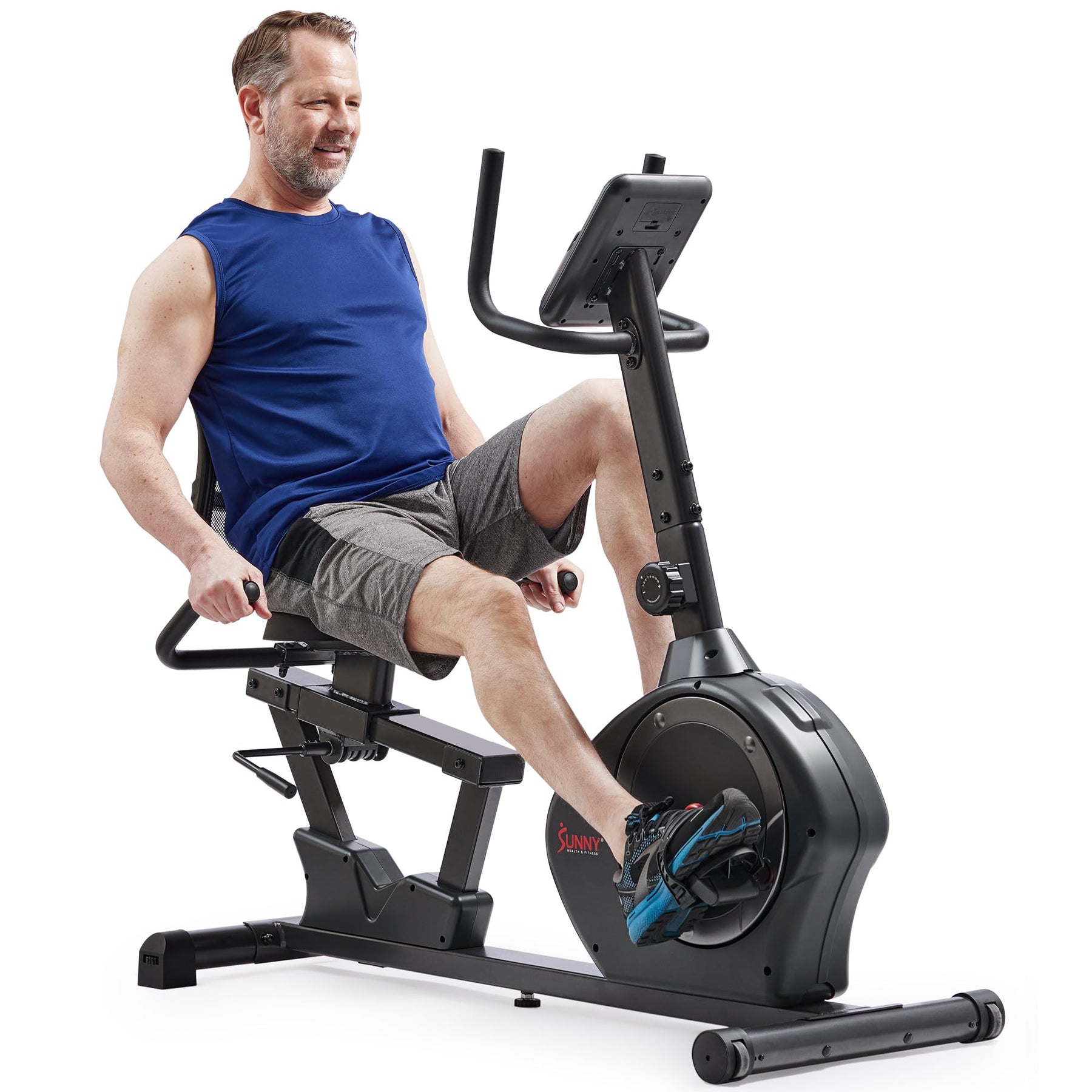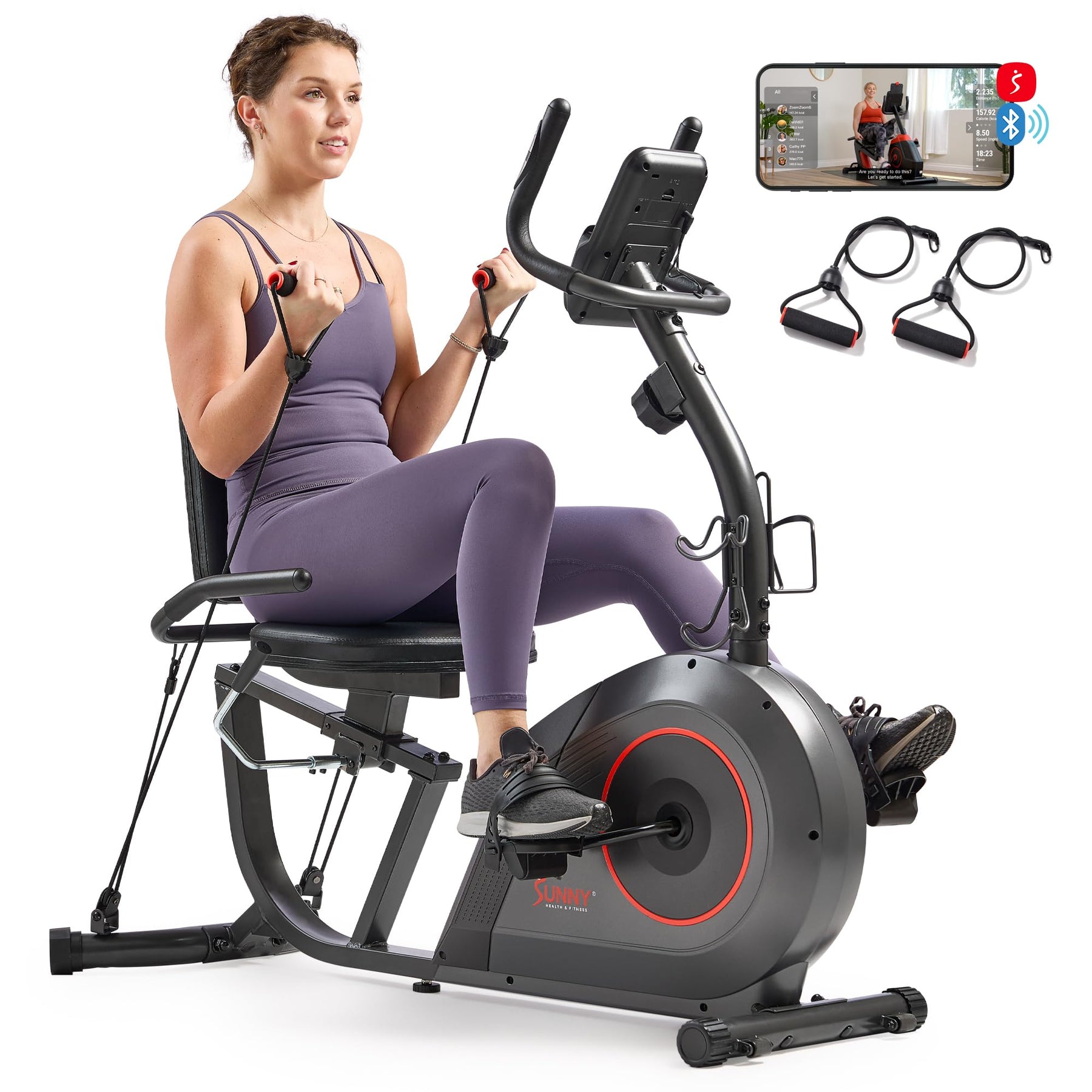Sunny Health & Fitness Smart Heavy-Duty Recumbent Bike w/Wide Cushioned Seat & Back, Indoor Cycling Machine for Adult/Seniors Home Exercise, Free SunnyFit App Connect, Optional Workout Training Bands