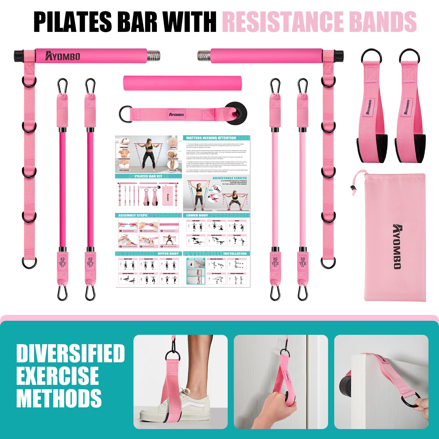 Pilates Bar Kit with Resistance Bands, Pilates Workout Equipment for Legs, Hip, Waist, Arm, Squats Exercise Equipment for Home Workouts, Adjustable 3-Section Pilates Bar Kit for Women & Men