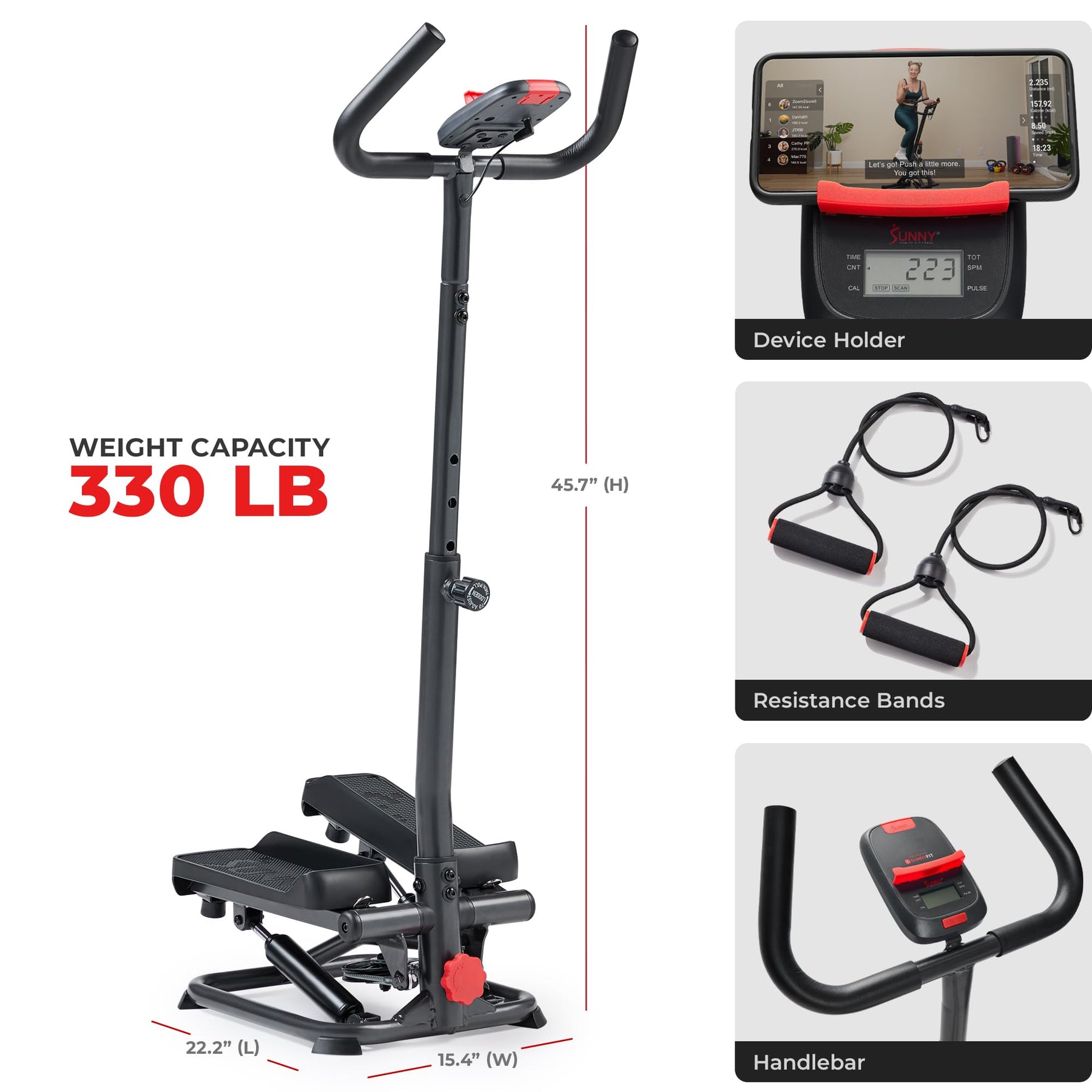 Sunny Health & Fitness Total Body 2-in-1 Smart Stepper Machine for Home with Handlebar and Resistance Bands, Total Body Workout, Adjustable Hydraulic, LCD Monitor, Non-Slip Pedals – 330 LB Max Weight